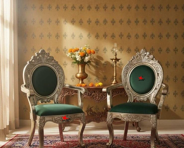 The chairs feature a premium antique German silver finish, highlighted with intricate floral and traditional motifs across the frame, legs, and borders. The plush velvet upholstery provides comfortable seating while enhancing the royal aesthetic. Built for stability and durability, these chairs are both functional and decorative.