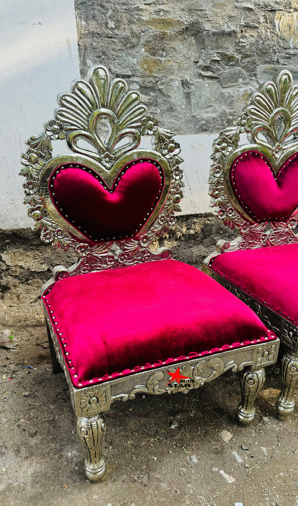 The chowki features a premium German silver finish paired with a rich velvet cushioned seat and heart-shaped backrest, offering both elegance and comfort. Its sturdy construction ensures durability, while the fine detailing adds a regal charm to any setting.